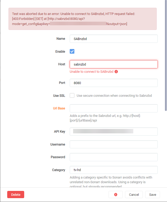 If you're trying to connect your Starr apps to SABnzbd and you're getting an error like Unable to connect to SABnzbd after clicking on Test.